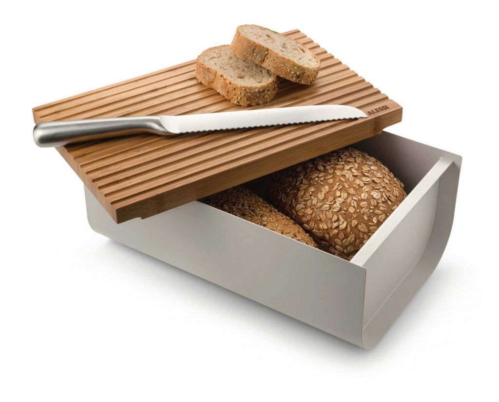 Der Korpus besteht aus Stahlblech mit einer Epoxidharz-Lackierung – die ist besonders langlebig und kratzbeständig. Als Deckel dient, wie bei anderen Brotkästen auch, ein Brett aus Bambusholz, dass auch als Schneidbrett dient. Die langen Nuten im Holz nehmen Krümel auf und geben dem Brot beim Schneiden Halt.