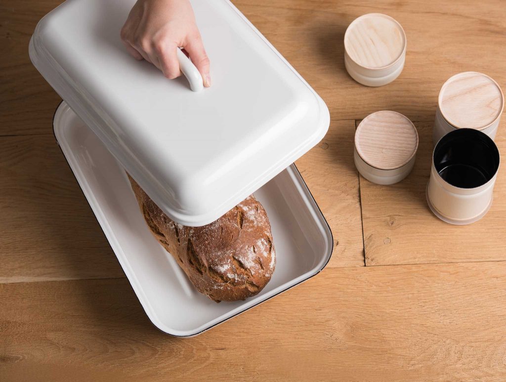 Emaille ist eine Glasur, die durch Erhitzen eine glasartige Oberfläche bildet und so besonders gut zu reinigen ist. Allerdings sollte man von der Reinigung im Geschirrspüler absehen. Am besten spült man die Dose zwecks Reinigung einfach mit Wasser und Essig aus. Die Lüftungslöcher im Deckel der eckigen, weißen Dose sorgen für ein ausgewogenes Klima im Inneren und halten das Brot schön frisch